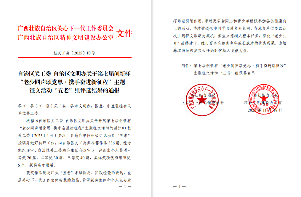 近日,从自治区关工委、自治区文明办传来喜讯,我校退休教师裴仁伟撰写的征文《为了培养学生 我总是说“有空”》,在第七届创新杯“老少同声颂党恩·携手奋进新征程”主题征文活动“五老”组中荣获三等奖。