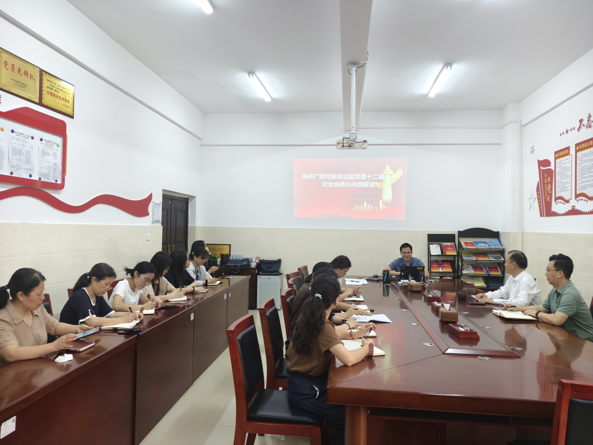 会议重点学习了全会提出的“十五五”时期广西经济社会发展的指导思想、主要目标和重点任务。张程同志进行了领学,解读了全会强调的“六个坚持”重要原则等内容,号召深刻认识全会部署与本地发展的紧密联系,主动融入平陆运河经济带建设,把握向海图强、开放发展的历史机遇。