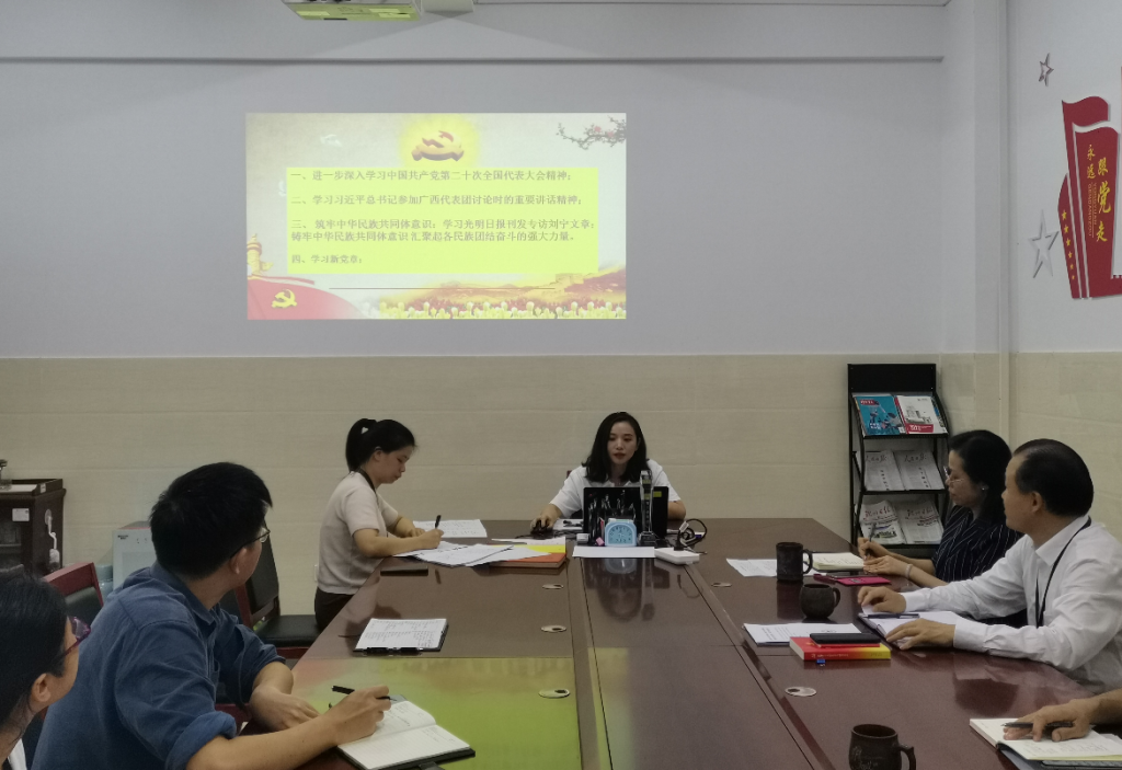吴玉琴同志带领大家进行《进一步深入学习中国共产党第二十次全国代表大会精神》《学习习近平总书记参加广西代表团讨论时的重要讲话精神》《铸牢中华民族共同体意识:学习光明日报刊发专访刘宁文章:铸牢中华民族共同体意识汇聚起各民族团结奋斗的强大力量》;《学习新党章》四个专题学习。重点以新发展理念引领广西高质量发展为主题,学习习近平总书记指引广西发展的新思路。