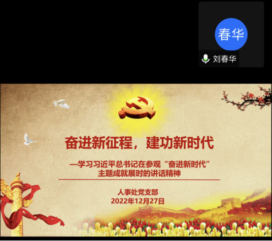 12月27日下午,人事处党支部通过腾讯会议在线上召开党的二十大精神专题学习会。会议由党支部书记朱芳阳主持,分别由朱芳阳和刘春华同志领学,全体党员同志参加了学习。