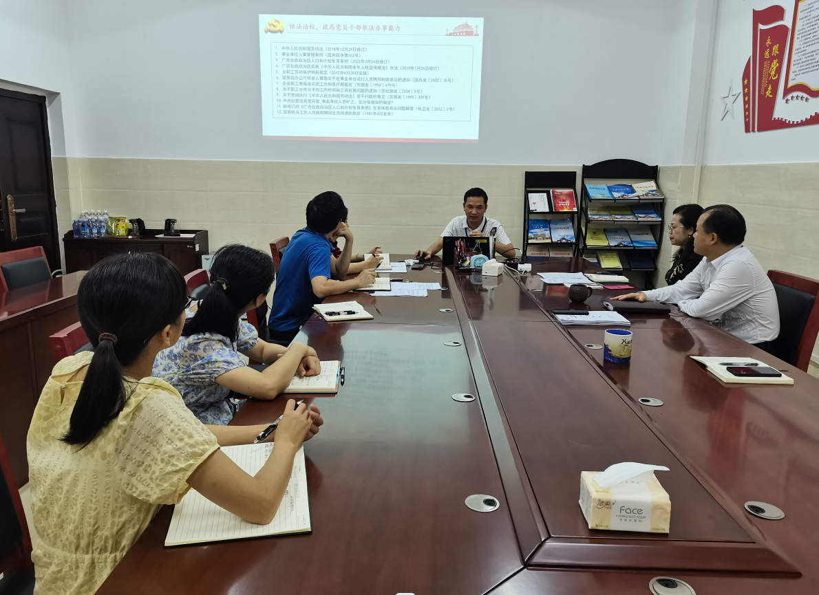 罗孟同志给全体党员上《依法治国依法治校提高党员干部依法办事能力》的党课。从推进新时代全面依法治国的重大意义、全面依法治国法治思想的主要内涵、书写新时代全面依法治国新篇章、依法治校提高干部依法办事能力四个方面进行深入讲解,结合人事处工作职责以及日常工作案例着重分析了如何依法治校提高干部依法办事能力。他指出,教育兴则国家兴,教育强则国家强。每一位党员要立足本岗位,深入学习教育相关法律知识和学校章程,增强责任感与使命感,严谨认真地做好本职工作,为学校的事业发展做出新的更大的贡献。