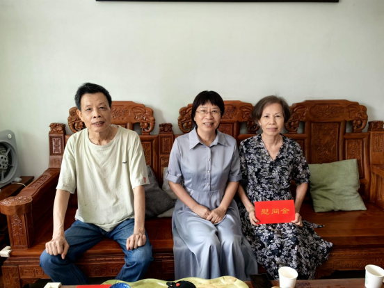 副校长陆衡(中)、人事处(离退休工作处)处长朱芳阳(左一)慰问了退休老党员禤秀凤、黄再裕