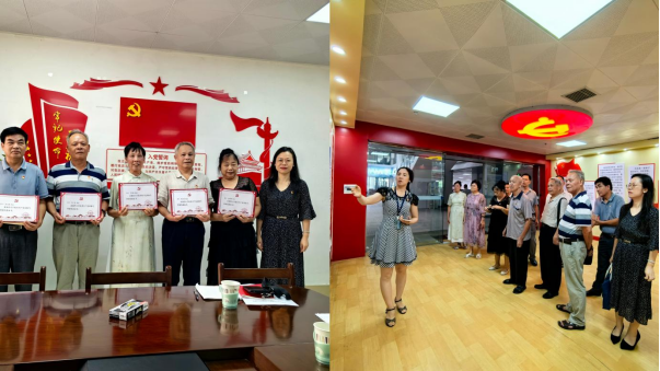 陈放同志为荣获学校“优秀共产党员”称号的退休教职工党员颁发荣誉证书及参观党史馆