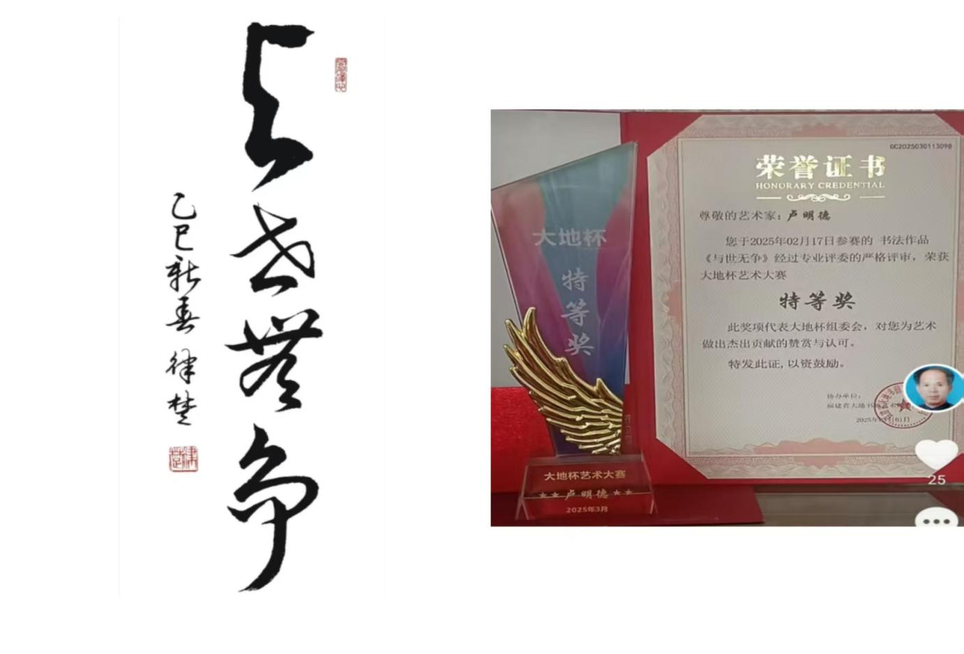 卢明德老教授荣获“大地杯”书画艺术大赛荣获书法 特等奖