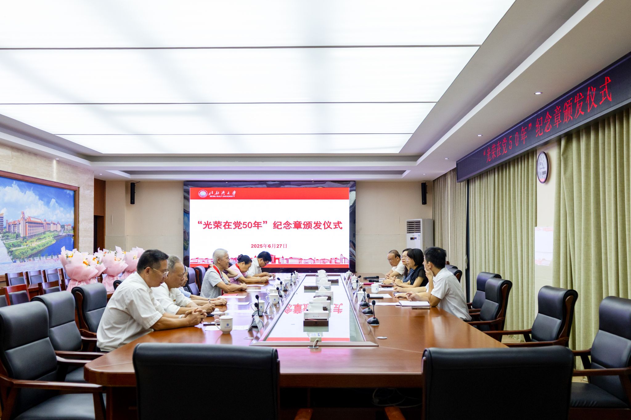 薪火相传守初心,红心向党写忠诚。6月27日,学校在办公楼523会议室举行“光荣在党50年”纪念章颁发仪式。校党委常委、副校长陆衡出席活动,为8位“光荣在党50年”老党员逐一佩戴纪念章并致以亲切慰问。党委组织部、人事处(离退休工作处)相关负责人、退休教职工党委委员参加活动。