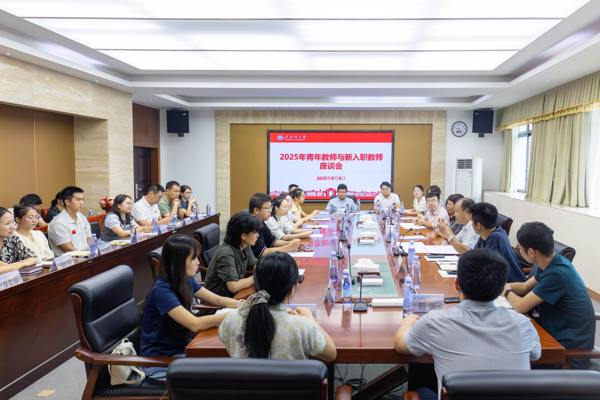 在第41个教师节来临之际,为倾听青年教师心声、凝聚发展共识、共谋育人新篇,2025年9月9日上午,学校在办公楼327会议室召开青年教师与新入职教师座谈会。校党委常委、副校长陆衡出席会议并讲话,党委教师工作部部长、人事处(离退休工作处)处长主持会议。来自各教学单位和职能部门的19位青年教师及新入职教师代表齐聚一堂,畅谈成长体会,共话使命担当。
