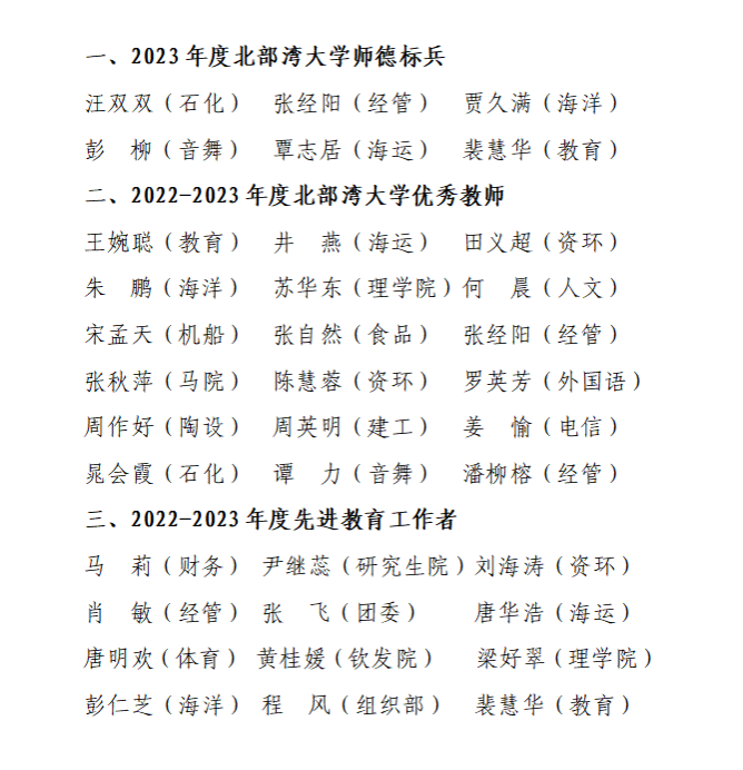 近日,在第40个教师节到来之际,学校完成了校级师德标兵、优秀教师、优秀教育工作者的评选活动。汪双双等6名教师荣获“2023年度北部湾大学师德标兵”荣誉称号,王婉聪等18名教师荣获“2022-2023年度北部湾大学优秀教师”荣誉称号,马莉等12名同志荣获“2022-2023年度先进教育工作者”荣誉称号。