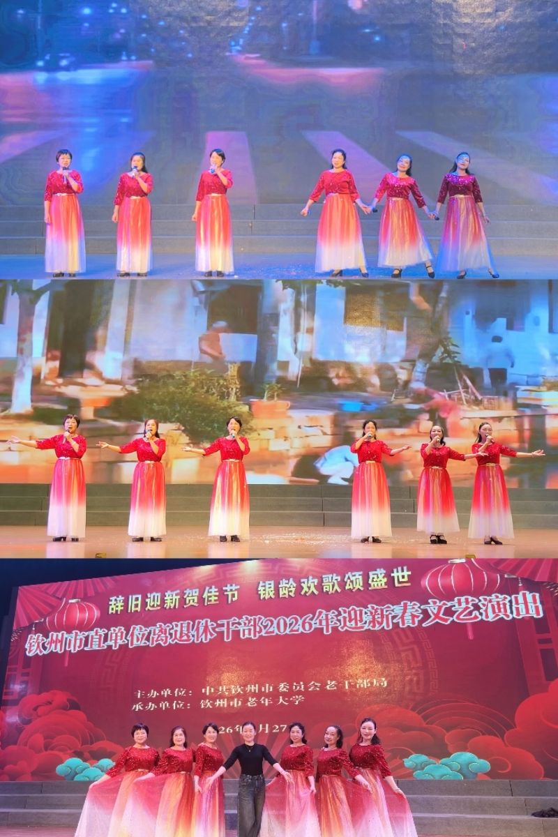 1月27日上午,钦州市离退休老干部局2026年迎新春文艺演出在钦州市老年大学多功能厅举行。我校推送退休教职工声乐小组唱作品《往日时光》参演,充分展现了老同志们的良好精神风貌。