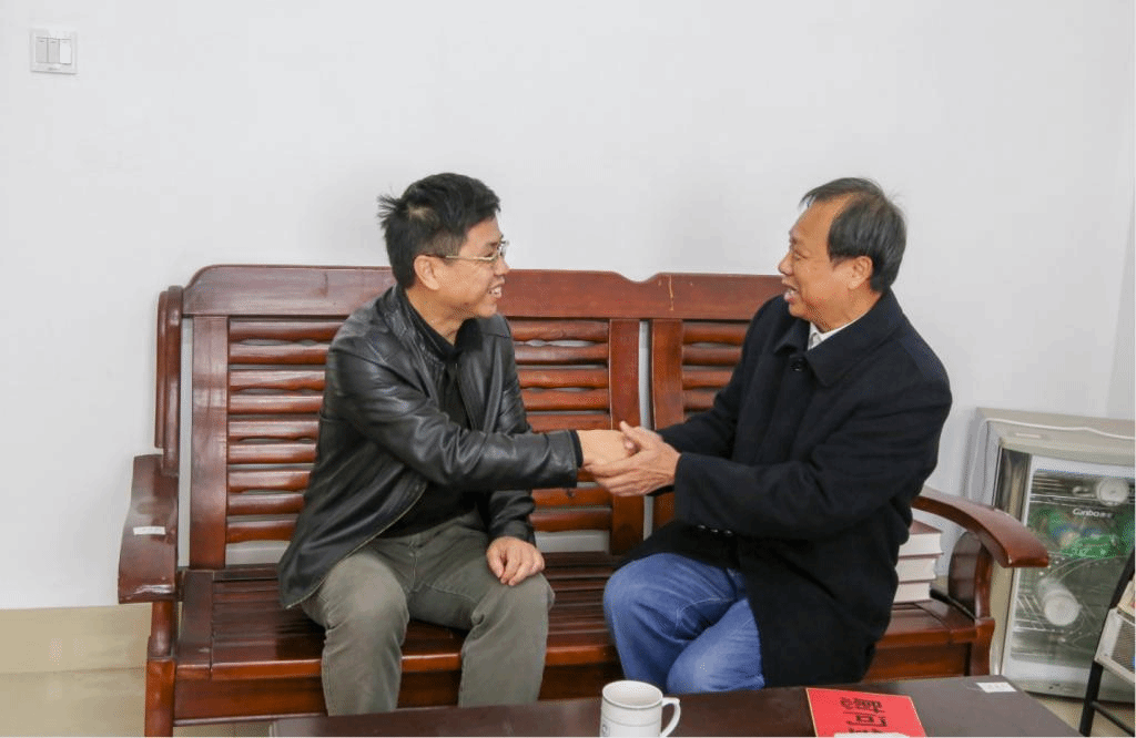 学校党委副书记陈锦山慰问张小强(左)、郭李芢(右)老领导